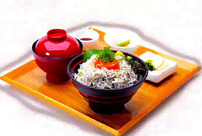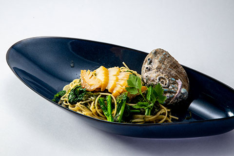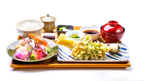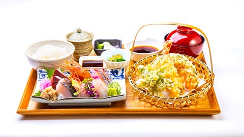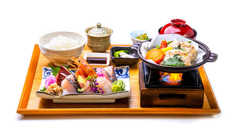 - ご飯、味噌汁、小鉢、香物、茶碗蒸、7点のお刺身盛合せのついたご膳に、鮮度抜群の”海のマルシェ”とれたてのアワビの柔らかな旨味と香を存分に楽しめる踊り焼きでご堪能ください。
