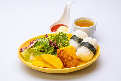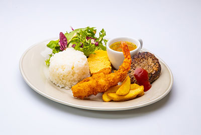- ハンバーグ・ポテトフライ・唐揚げ・エビフライ・卵焼き・スープ